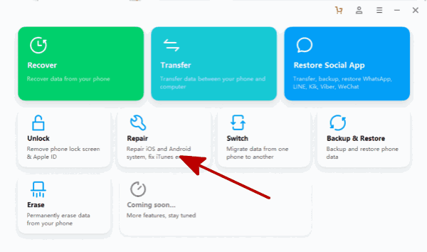 Schritt 1: Laden Sie EelPhone iTunes Repair auf den Computer herunter. Auf der Hauptseite klicken Sie bitte die Funktion „Reparieren“, mit der iDevice/android/iTunes-Probleme reparieren können.