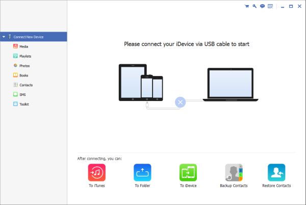 Schritt 1: Laden Sie EelPhone iPhone Transfer auf den Computer herunter und starten Sie es nach der Installation. Alle Datentypen auf der linken Seite des Werkzeugs können zwischen iPhone und PC verwaltet werden. Sie können nicht nur iPhone-Daten auf dem Computer speichern, sondern auch Daten vom Computer zum iPhone hinzufügen.