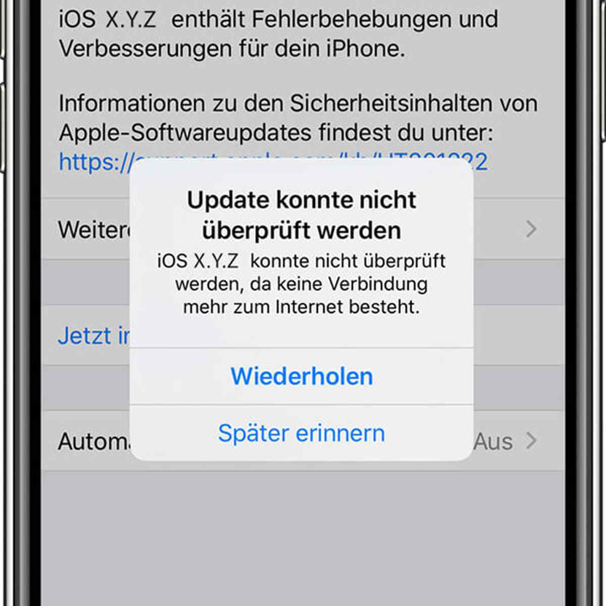 Nach mehreren Versuchen erscheint auch die Meldung „Update konnte nicht überprüft werden“. Halten Sie den Netzschalter gedrückt, um das iDevice neu zu starten, und aktualisieren Sie dann die Software erneut über die Einstellungen.